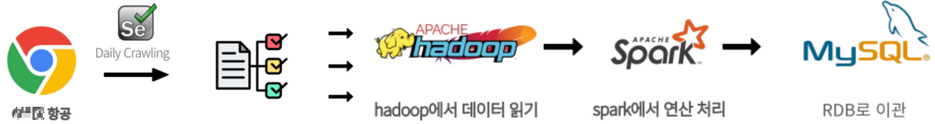 ํญ๊ณต๊ถ ์ ๋ณด๋ฅผ Selenium์ ํ์ฉํด ํฌ๋กค๋งํด์ ํ์ผ๋ก ์ ์ฅํ๊ณ , ํฐ ์ฉ๋์ ํ์ผ(๋น ๋ฐ์ดํฐ)๋ฅผ Hadoop์์ ์ฝ์ด ์ฒ๋ฆฌํด์ ์ ์ฅํ๊ณ , Spark๋ฅผ ํตํด ๊ณ ์์ผ๋ก ์ฐ์ฐ ์ฒ๋ฆฌ๋ฅผ ํ๊ณ , RDB๋ก ์ด๊ดํ๋ ๋ฐ์ดํฐ ํ์ดํ๋ผ์ธ์ ์ค๊ณํ๋ค.