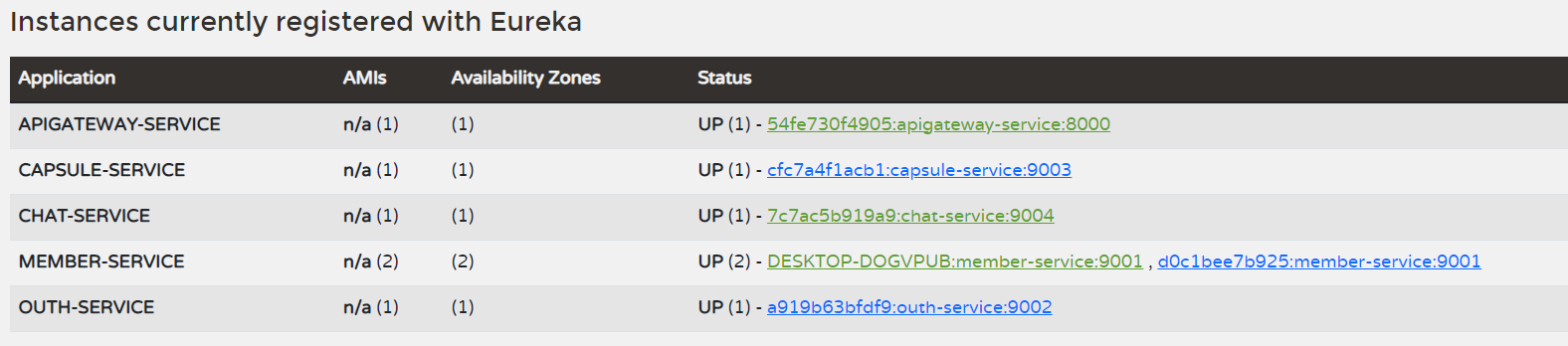 Eureka Service url๋ก ๋ค์ด๊ฐ์ Eureka์ ๋ฑ๋ก๋ ์ฑ๊ณผ ์ธ์คํด์ค๋ค์ ํ์ธํ๋ ํ ์ฑ์ ์ฌ๋ฌ ์ธ์คํด์ค๋ค์ด ๋ฑ๋ก๋์ด ์์๋ค.