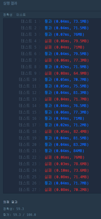 ํ์ง๋ง ์ด๋ ๊ฒ ํ์๋๋ ๋ชจ๋ TC๋ฅผ ํต๊ณผํ์ง ๋ชปํ์ฌ 59์ ์ด ๋์๋ค. ๊ฒ์ํ์ ๋ณด๋ ์์ ์๋ ๊ทธ๋ฆฌ๋๋ก ํ๋ ธ๋ค๊ณ ํ์ง๋ง, TC๊ฐ ์ถ๊ฐ๋๋ฉด์ ๋ฌธ์ ๊ฐ ๊ทธ๋ฆฌ๋๋ก๋ ํ ์ ์๊ฒ ๋ฐ๋ ๊ฒ ๊ฐ๋ค๊ณ ํ๋ค. ๊ทธ๋ฆฌ๋๋ผ๋ ์นดํ ๊ณ ๋ฆฌ์ ์์ง ๋ง์!