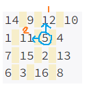 ๋ค์๊ณผ ๊ฐ์ด ํ์ฌ 5์ ์์น์์ ์ด๋ํ ์ ์๋ ๊ณณ์ ์๋จ์ธ 12์ ์ผ์ชฝ์ธ 11์ด๋ค. ์๋จ์ ๋จผ์ ํ์ํ๊ฒ ๋ ๊ฒฝ์ฐ 5์ ์์น์ DP ๊ฐ์ 1+1 = 2๊ฐ ๋ ๊ฒ์ด๋ค. ํ์ง๋ง ๋ค์์ ์ผ์ชฝ์ธ 11์ ํ์ํ๊ฒ ๋๋ค๋ฉด 2+1 = 3์ผ๋ก, ๋จผ์ ํ์ํ 2๋ณด๋ค ๊ฐ์ด ๋ ํฌ๋ฏ๋ก DP ๊ฐ์ ๊ฐฑ์ ๋์ด์ผ ํ๋ค.