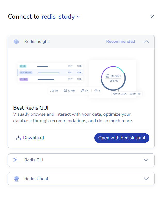 Redis๋ฅผ CLI๋ก ์ฐ๊ฒฐํ ์๋ ์์ง๋ง, GUI๋ก ์ฐ๊ฒฐํด์ ๋ณด๊ธฐ ์ํด RedisInsight ๋ผ๋ ๊ฒ์ ์ค์นํ๋ค.