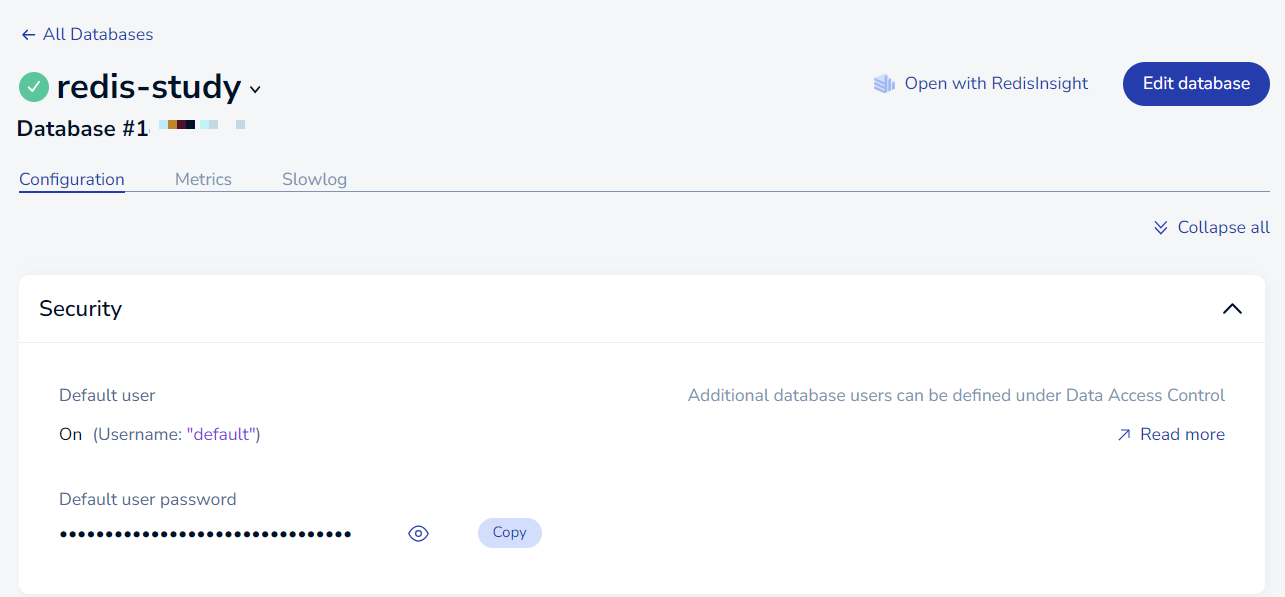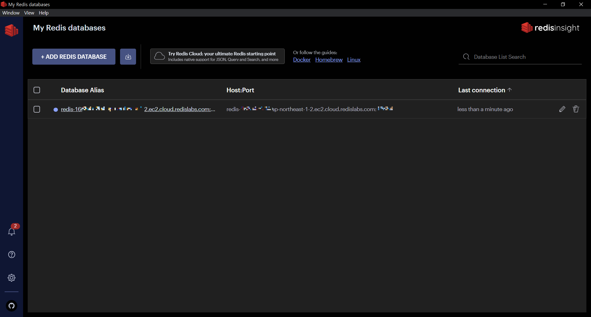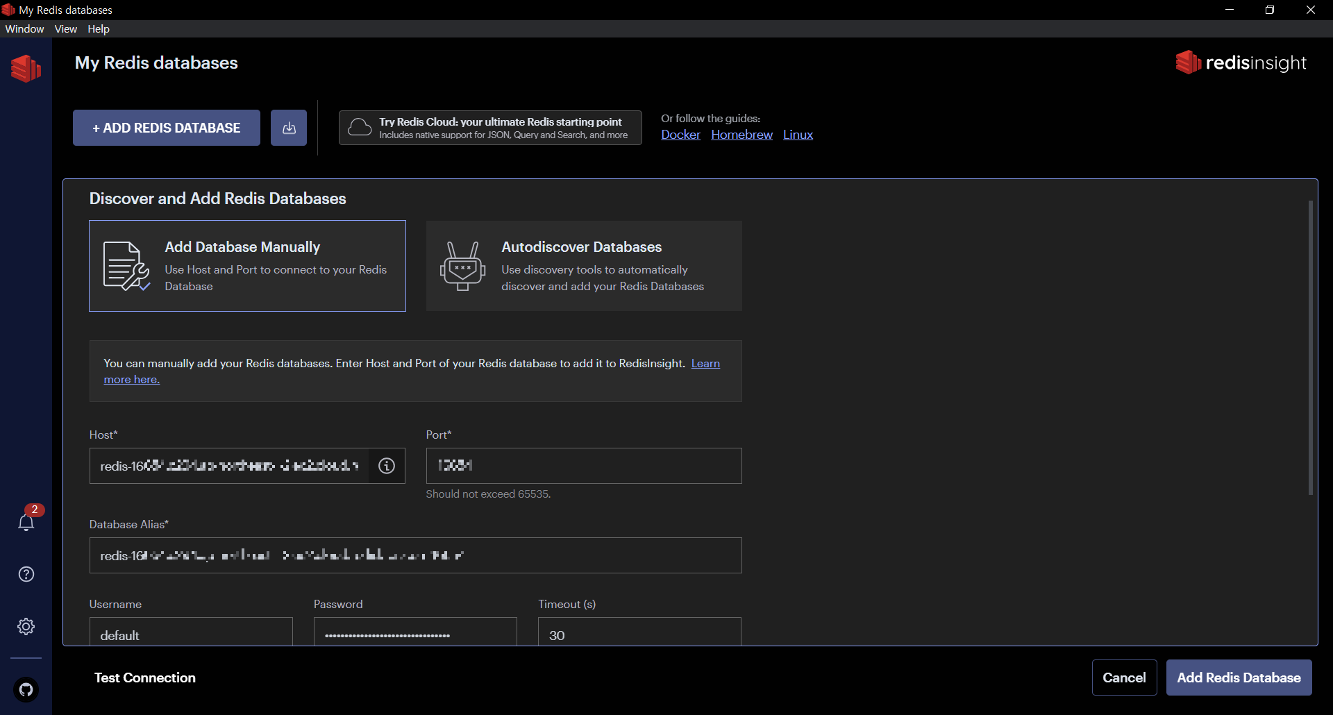 Host, Port, Username, Password๋ฅผ ์ ๋ ฅํ๊ณ Add Redis Database๋ฅผ ํด๋ฆญํ๋ฉด ๋๋ค!