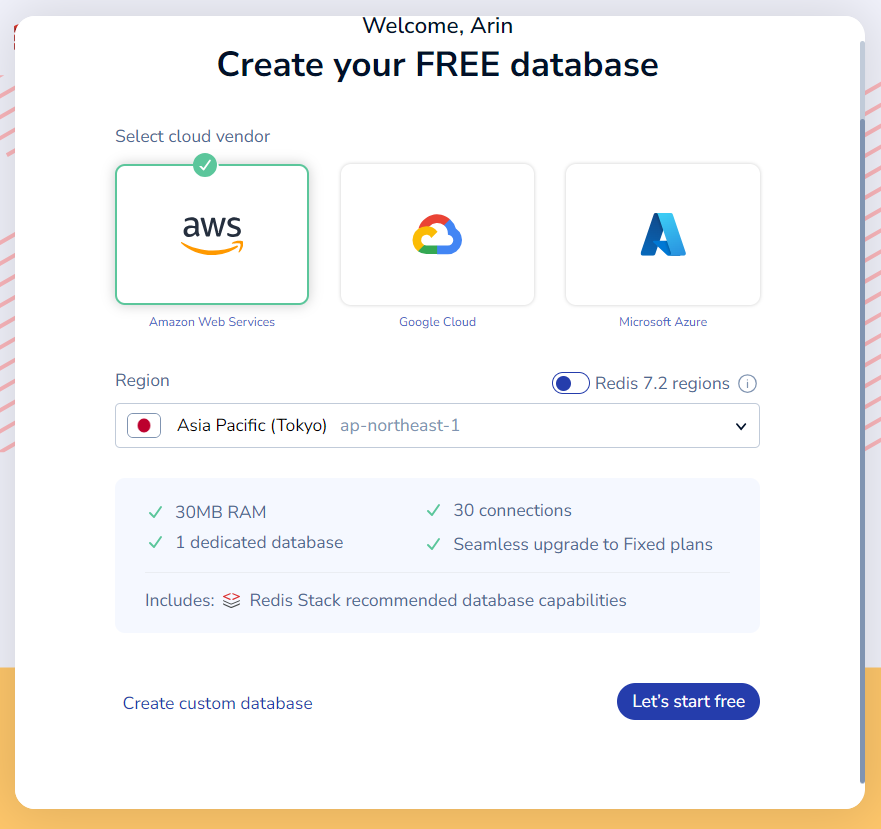 Redis๋ฅผ ํ์ตํ๊ณ ๊ฐ๋จํ ํ๋ก์ ํธ๋ฅผ ๊ตฌ์ถํ๋ ๋ฐ, ๋ก์ปฌ์ด๋ Docker๋ก Redis DB๋ฅผ ๊ตฌ์ถํด๋ ๋์ง๋ง.. Redis Cloud๊ฐ ๊ถ๊ธํ๊ธฐ๋ ํ๊ณ , ํ๋ฒ ์จ๋ณด๊ณ ์ถ์ด์ Redis Cloud์ ๊ฐ์ ํด์ ์จ๋ดค๋ค! (+ AWS์ฒ๋ผ ํ์๊ฐ์ ์ ํ๋ฉด ๊ณ์ ๋น 1๊ฐ์ Redis DB๋ฅผ ๋ฌด๋ฃ๋ก ์ฌ์ฉํ ์ ์๋ค.)