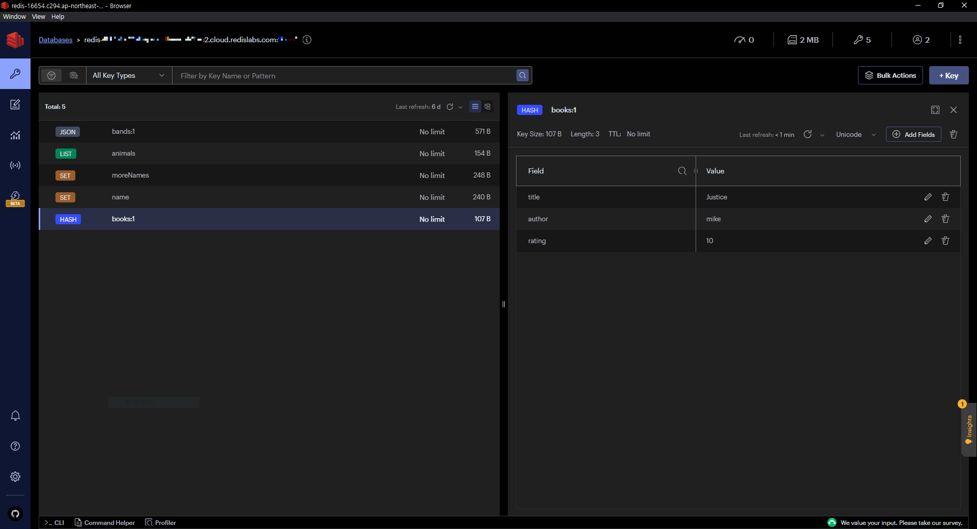 ์ฐ๊ฒฐ๋ Redis Cloud DB์ GUI์์์ ์ฟผ๋ฆฌ๋ฅผ ์ฐ๊ณ ์ ์ฅ๋ ๋ฐ์ดํฐ๋ฅผ ํ์ธํด๋ณด์๋ค.