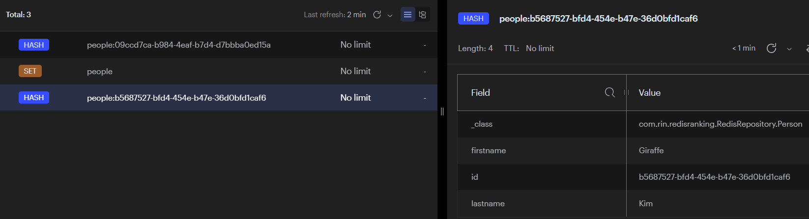 - `save()` : id가 null이라면 새로운 id를 생성하고, key가 `keyspace:id` (people:id값)패턴으로 저장되고, Redis의 Hash로 객체(Person)가 저장된다.