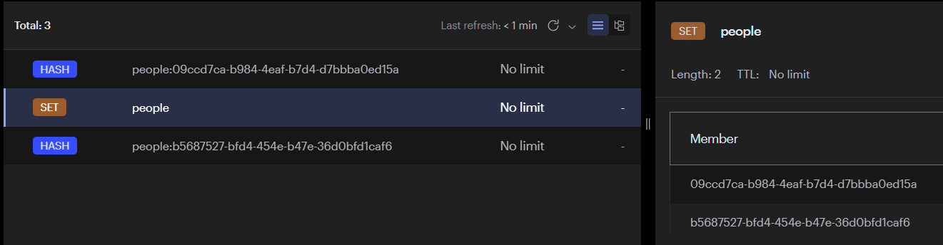 - `@RedisHash` 의 값이 Set의 key로 들어가고, value(member)에는 `@Id` 의 값이 들어가게 된다.