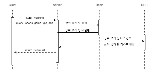 - 2. Redis์์ ์์ฒญ์ key(sports+gameType+sortType)๋ก ํ๋ ์์ 10๊ฐ ํ์ ๊ฒ์ํ๋ค.