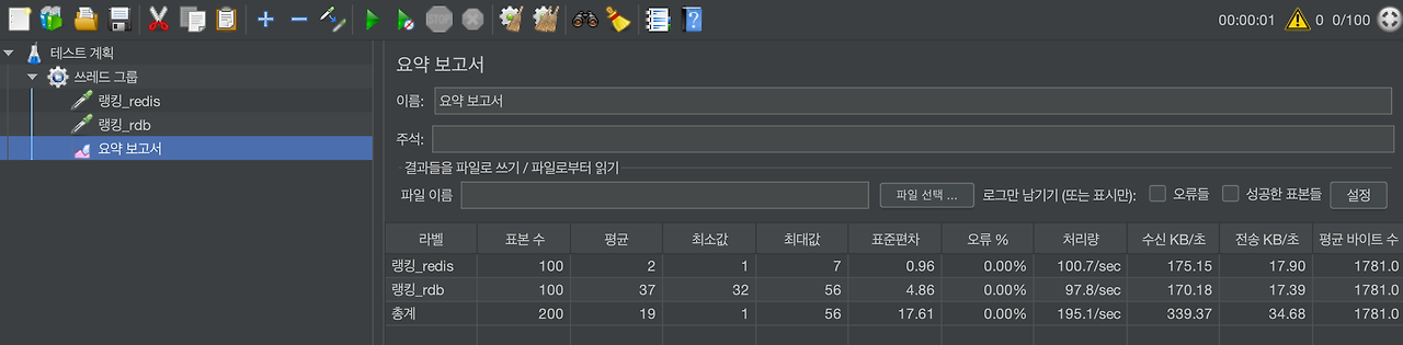 ๊ทธ๋ฆฌ๊ณ ๋์์ 100๋ช ์ด API๋ฅผ ์กฐํํ๋ ์ํฉ์์์ ํ ์คํธ๋ฅผ ์ํด JMeter๋ฅผ ํ์ฉํ์ฌ ๋ถํํ ์คํธ๋ฅผ ์งํํ๋ค.