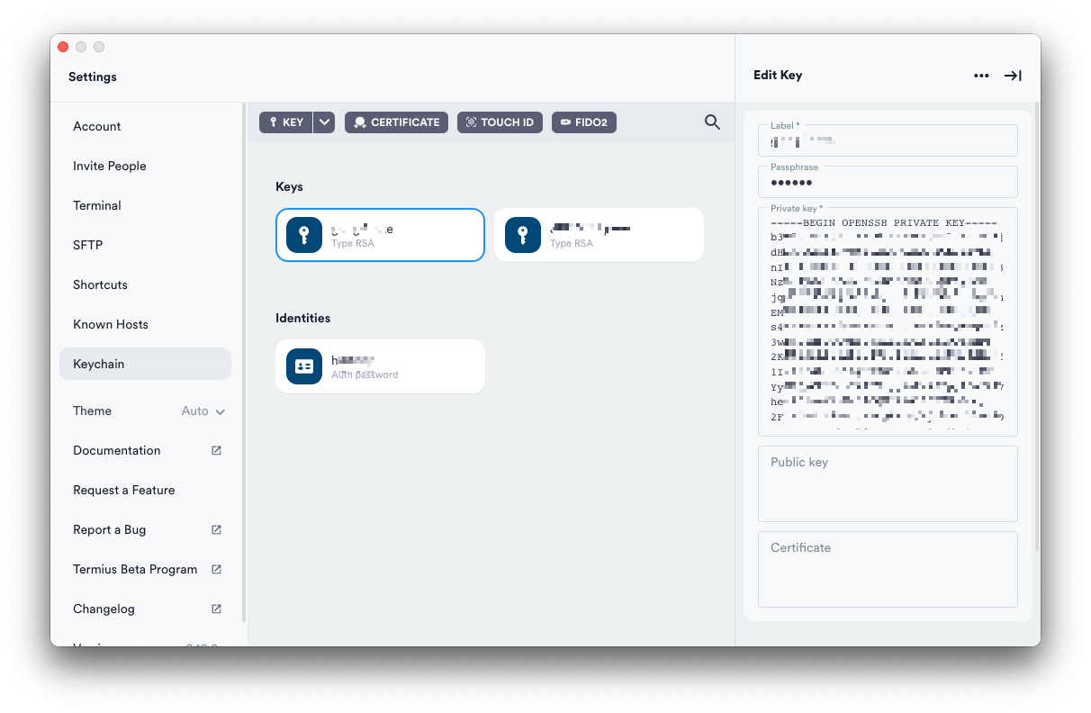 Termius์์ ์ ์์ ํ๊ธฐ ์ํด์๋ ๊ฐ์ธํค๋ฅผ ๋ฑ๋กํด์ผ ํ๋ค. ํค ์์ฑํ ํด๋์์ `cat ~/.ssh/id_rsa`๋ก ์์๋ผ ์ ์์๋ค.