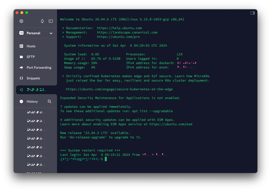Termius๋ ssh ์๊ฒฉ ์ ์ ํ๋ซํผ์ธ๋ฐ, ์๋ฒ host๋ ํค ๋ฑ๋ก๋ง ํด์ฃผ๋ฉด ํด๋ฆญ ํ ๋ฒ๋ง์ผ๋ก ์ฝ๊ฒ ์ ์์ ํ ์ ์๋ค. ๊ทธ๋ฆฌ๊ณ SFTP๋ ์ ๊ณตํ์ฌ ๋ด ๋ก์ปฌ ์ปดํจํฐ์ ์๋ ํ์ผ๋ ์ฝ๊ฒ ์ด๋์ํฌ ์ ์๋ค. + UI๊น์ง ์ข์