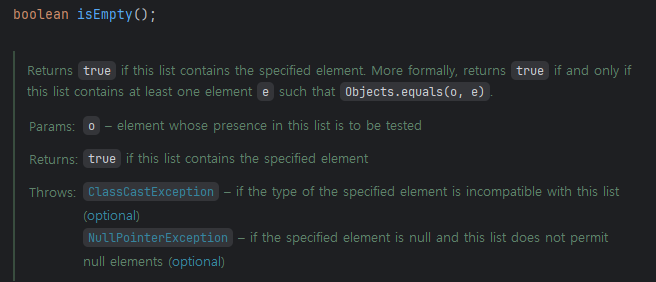 - `isEmpty()` : null ์ด๊ฑฐ๋ empty์ธ ๊ฒฝ์ฐ ๋ชจ๋๋ฅผ ๊ฒ์ฌํ์ฌ, ๊ฒฐ๊ณผ ๊ฐ์ boolean์ผ๋ก ๋ฆฌํดํ๊ณ ์๋ค.