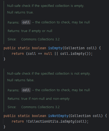 ๊ทธ๋ฆฌ๊ณ List๊ฐ null ์ธ์ง์ ๋น์๋์ง๋ฅผ ๋ชจ๋ ํ์ธํด์ค์ผ ํ ์ผ์ด ์๊ฒผ๋๋ฐ, Spring์์ ์ ๊ณตํ๋ CollectionUtils์ ์ฐ๋ฉด ํ ๋ฒ์ ์ฒดํฌํ ์ ์๋ค๋ ๊ฒ์ ์๊ฒ ๋์๋ค. ๊ทธ๋์ ๊ทธ ๋ด์ฉ์ ์ ๋ฆฌํ๊ณ ์ ํ๋ค.