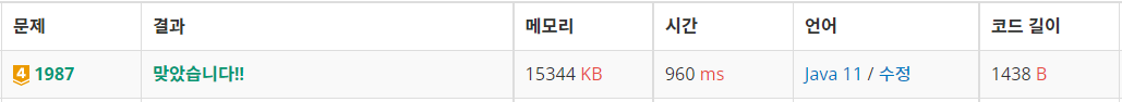 ๋๋ visited[x][y] ๋ฐฐ์ด์ ์ฌ์ฉํ์ฌ ์ขํ์ ๋ฐฉ๋ฌธ ์ค๋ณต์ ๋ง๋๋ก ํ์๋ค. ํ์ง๋ง ์ด ๋ฌธ์ ์์๋ ์ขํ์ ๋ฐฉ๋ฌธ ์ค๋ณต์ ๋ง๋ ๊ฒ์ด ์๋๋ผ, ๋ฌธ์์ ์ค๋ณต์ ๋ง์์ผ ํ๋ค. ์ฆ, ์ํ๋ฒณ๋ง ๋ค๋ฅด๋ค๋ฉด ์ด์ ์ ๋ฐฉ๋ฌธํ๋ ์ขํ๋ฅผ ํ์ ๋ฐฉ๋ฌธํด๋ ๋๋ค.